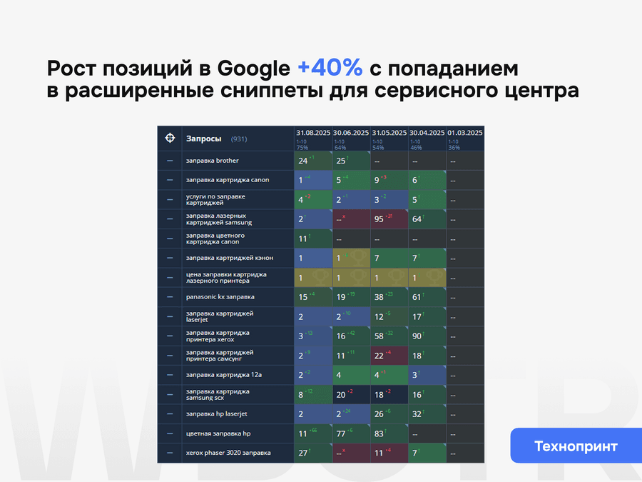 После базового усиления переходим к следующему уровню: расширяем структуру, усиливаем рабочие зоны и переводим проект в режим системного роста из поиска без потери управляемости внутри CMS. Если бизнес оценивает результат через стоимость лида, окупаемость, выручку или другие коммерческие метрики, приоритеты SEO также выстраиваются вокруг этих показателей, а не только вокруг роста видимости.